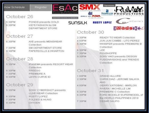Below are the schedules of this year’s PFW and on October 31, 2010 @ 6:30PM, Ford Models’ Supermodel of the World Philippines will choose the country’s representative to the international competition of the same name.
