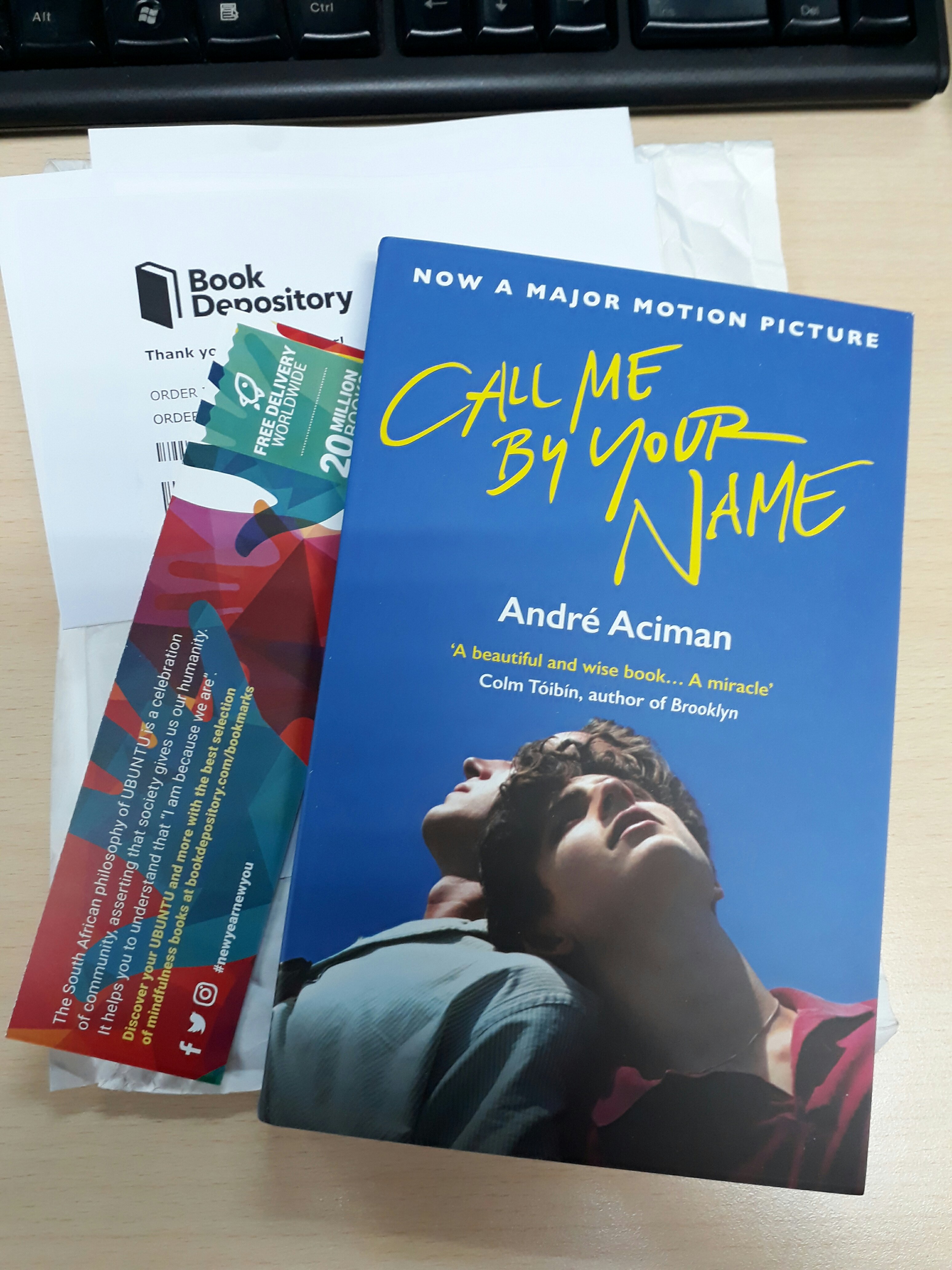 After coming from our long holiday weekend, I found this on top my work desk. It looks like it was received by the local post office (Pasig) last Friday, January 1 and was delivered directly to my office address. Call Me By Your Name was the first book in my order that was initialy dispatched! It was well-packaged and totally brand new!