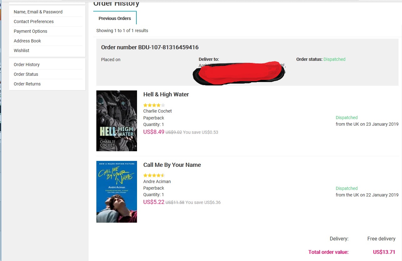 I ordered the movie tie-in edition of Call Me By Your Name by Andre Aciman and the first book of the THIRDS series Hell & High Water by Charlie Cochet last January 21, 2019 and you can see on the image below that they were dispatched at different dates. I actually emailed their support team about this and they said it is to avoid delay as they would need to get some books from separate warehouses or suppliers.