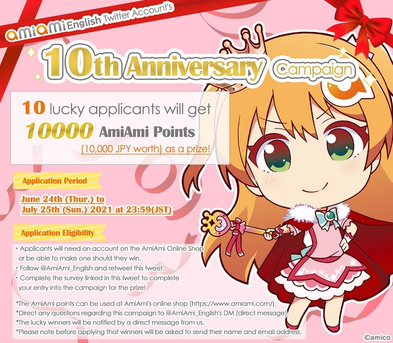 July 2021 is the start of AmiAmi English Twitter Account’s 10th year and they are giving away 10,000 AmiAmi Points (10,000JPY worth) to 10 lucky winners in a campaign draw! Below are the rules on how you can participate while the campaign is still running!