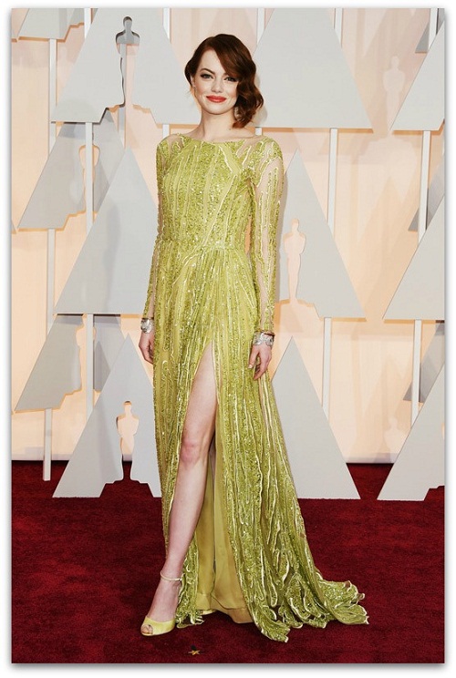 The refine beauty of Emma Stone is off the charts in this long-sleeved mint green Elie Saab gown ! She nailed it from head to toe! Easy A!